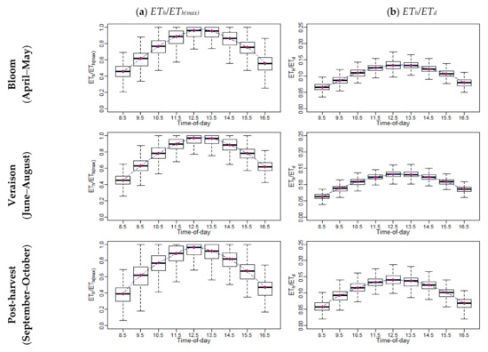 An example of the diurnal variations of (a) and ETh/ETh(max) and (b) ETh/ETd at different phenological vine stages for Sierra Loma Sites 1 and 2 between 2014 and 2018.