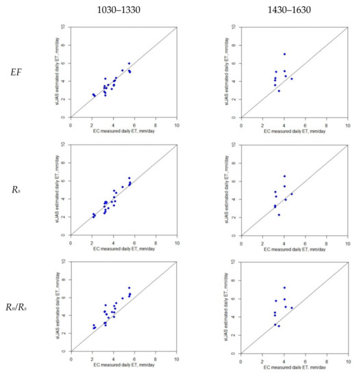 According to Van Neil et al. [40], the Rs approach is robust when upscaling ETi to multiple timeframes (e.g., daily, 8-day, and monthly). Moreover, many studies have indicated that solar radiation (Rs) is the most robust scalar approach that explains the ratio between the ETd and ETi [41].