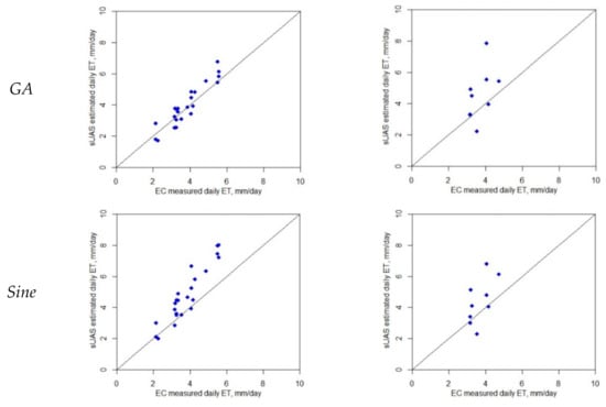 The Gaussian (GA) approach has been used recently by Liu et al. [43] to retrieve the ETd from remotely sensed instantaneous ET. The study used ETi observations from an EC system and found that the ET diurnal variation follows a Gaussian-fitting curve. When comparing this approach to the Sine and EF approaches, results from the study of Liu et al. [43] indicated that GA is more accurate using the eddy covariance (EC) system.