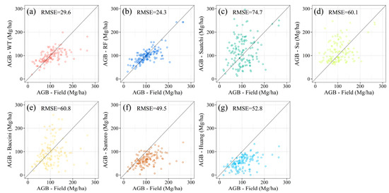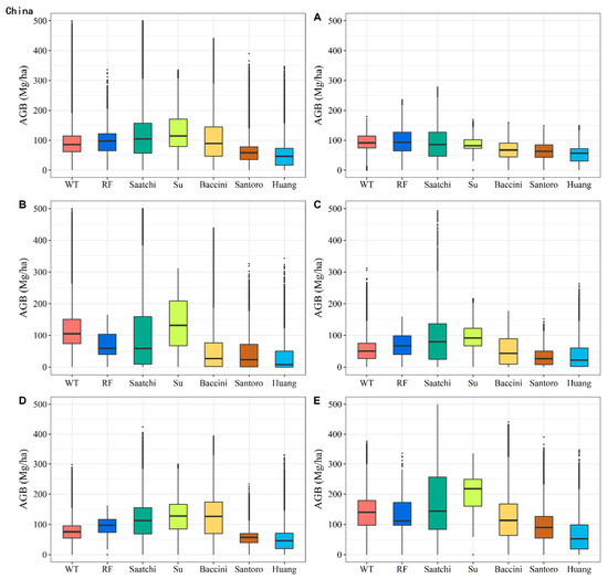- Huang, H.; Liu, C.; Wang, X.; Zhou, X.; Gong, P. Integration of multi-resource remotely sensed data and allometric models for forest aboveground biomass estimation in China. Remote Sens. Environ. 2019, 221, 225–234. [Google Scholar] [CrossRef]