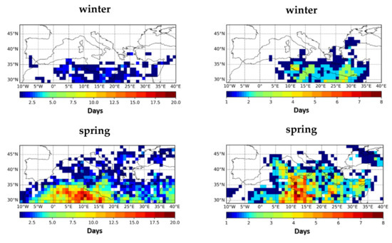 The geographical distribution of the total number of strong (left panels) and extreme (right panels) DAEDs that took place over the broader MB from 2005 to 2019 in each season is given in Figure 4. For an easy comparison of the seasonal frequencies, identical colorbar scales are used in the graphs. It is clearly shown that spring and summer are the seasons with the highest frequencies of strong DAEDs (up to 20), opposite to autumn and winter, when only up to 2–3 strong DAEDs occurred. The results for extreme DAEDs reveal a different seasonality, with maximum frequencies only in spring (up to 8 DAEDs), lower frequencies in winter and summer (up to 2–3 DAEDs) and even fewer DAEDs in autumn (less than 2). The geographical patterns of strong DAEDs do not show remarkable difference among seasons, exhibiting the highest frequencies over the western part of North Africa and the easternmost part of MB (Middle East) in spring and summer, against very small frequencies (bluish colors) over the central and easternmost parts of the basin in winter and autumn. On the contrary, different spatial patterns are found for extreme DAEDs. The highest frequencies of extreme DAEDs are observed over the eastern and central MB in winter and especially in spring, while in summer and autumn the—clearly smaller—maximum frequencies shift to the western MB (mostly over western North Africa). This longitudinal shift of DAEDs with the course of seasons is attributed to the prevailing atmospheric conditions. This is shown in Figures S2 and S3, where, as an example, the atmospheric circulation, i.e., the geopotential height and the wind vectors and the associated dust export during two DAECs that took place over MB in spring and summer are shown.