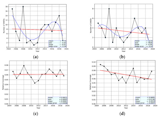 The interannual variations and trends (red lines) of various characteristics of strong and extreme Mediterranean DAEDs that took place during the 15-year period 2005–2019 are presented in Figure 5. Specifically, the number of DAEDs, the percent spatial coverage of the study area by dust episodic pixels and the average DOD of episodic pixels are reported per year both for strong (left panels) and extreme (right panels) DAEDs. Such interannual variabilities can be important in a two-way relation to the ongoing climate change, i.e., in terms of possible effects of climate change on dust episodes, and also possible implications of changing dust episodes for climate. Both strong and extreme DAEDs exhibit a large year by year variability, ranging from 1 to 18 (strong) and 1 to 8 (extreme) DAEDs, accompanied by slight, but not statistically significant, decreasing trends, a little stronger for extreme DAEDs (Figure 5a,b). As revealed in Figure S4, where the corresponding interannual variation of strong and extreme DAEDs is given per season, this overall decrease arises from a decrease in winter and spring. The applied 4th order polynomial fit (found to ideally represent the interannual variability) to the time series (blue dashed lines) reveals a lower frequency variability, which is characterized by decreasing tendencies in the 2000s followed by increasing tendencies in the 2010s. In general, there is some covariability of strong and extreme DAEDs, with common years having high (2005, 2008) and low (2007, 2009, 2011, 2012, 2019) frequencies of strong and extreme DAEDs. These maxima/minima can be connected with corresponding minima/maxima in precipitation over the study area, according to the data derived from the Global Precipitation Climatology Project [62].