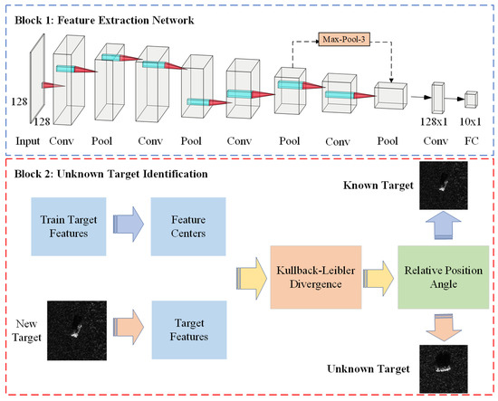 Traditional end to end SAR image unknown target recognition methods [3,6,26,29,31] bear problems such as target feature closure, lack of effective processing, and operation for target features. When faced with unknown targets that are not involved in training, these traditional methods cannot effectively identify the unknown targets. Therefore, this paper leverages two parts, feature extraction and target identification, to fully process the target features and achieve the accurate identification of unknown targets. Firstly, the SAR target is trained by FEN to construct a feature mapping space and extract the target features. Then, the KLD–RPA joint discrimination algorithm for the unknown SAR target is used to accurately identify known and unknown targets.