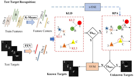 In the procedure of identifying an unknown SAR target, traditional feature subspace mapping discrimination methods have low recognition accuracy due to the absence of analysis and processing of the target features. Therefore, this section proposes a KLD–RPA unknown SAR target identification algorithm based on target feature analysis and joint discriminant to achieve the accurate identification of unknown targets. The proposed algorithm principle is shown in Figure 3. First of all, the SAR target image is converted into a 128 × 1 dimensional feature vector by FEN. Subsequently, all the targets of each category in the training set are individually calculated by the K-Means clustering algorithm to obtain a stable and reliable target category center, and the above steps are repeated to acquire all known target category centers. In the testing phase, the KLD between the feature vector of the test target and the category feature center of the known target is calculated to obtain the similarity between the test target and the known target. Afterwards, the test target category is roughly identified by setting an appropriate threshold. For the targets that cannot be distinguished by KLD, firstly, t-SNE nonlinear dimensionality reduction is performed, and the target features are mapped from high dimensional space to two-dimensional plane space. Then, the RPA between the test target and the nearest known target category center is estimated. Finally, the test target is finely identified through RPA. If the test target is a known target, it is input into the SVM classifier for further classification, otherwise it is marked as an unknown target.