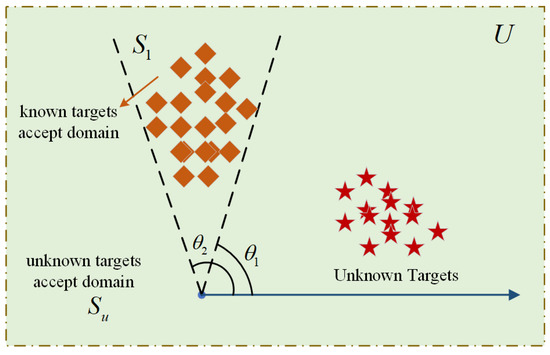 Suppose that there is only one type of known targets and unknown targets among the targets that input the RPA identification module, as shown in Figure 4, the overall target accepted domain is , and the known target accepted domain is . Thus, the unknown target accepted domain is: