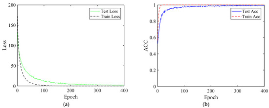 This experiment mainly analyzes and tests the learning ability of the FEN model. Figure 6a shows the train–test error curve of FEN on the 10-type dataset. It can be seen that the training error and the testing error rapidly converge and decrease, and eventually approach to zero with the increase of epoch. Meanwhile, the accuracy of the training set and the testing set also rise speedily and reach to a peak, as illustrated in Figure 6b. This indicates that FEN has a strong learning ability and can effectively approximate the data characteristics of the target sample in the training set. In addition, through the learning of universal features in the target samples of the training set, the target samples of the testing set can be accurately recognized.