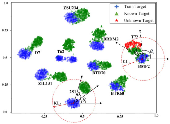 Therefore, RPA can not only effectively solve the problem of KLD numerical aliasing between target features, but also be used to alleviate the SCA problem of multiple types of targets existing in traditional absolute angle similarity measurement methods. Moreover, we believe that in other types of data processing, RPA based measurement methods also have significant application prospects. In addition, through the visualized target feature mapping subspace, the position and direction information between different target features can also be easily and intuitively obtained. For example, the unknown target T72 is similar to BMP2 and is located on the right side of BRDM2 and other spatial information. In addition, this spatial information can increase our understanding and further processing of unknown targets.