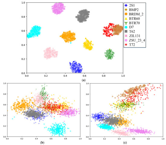 SAR target feature mapping subspace distribution after t-SNE visualization processing: the horizontal and vertical axes represent target feature in the two-dimensional space after the t-SNE dimensionality reduction in the high dimensional feature space.