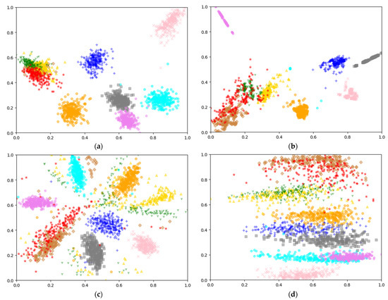 Visualizations of 2425 targets from the Testing Set in 10-type Dataset. (a) Visualization by LDA; (b) visualization by ISOMAP; (c) visualization by MDS; (d) visualization by TRTE. The horizontal and vertical axes represent the target feature in the two-dimensional space after the t-SNE dimensionality reduction in the high dimensional feature space.