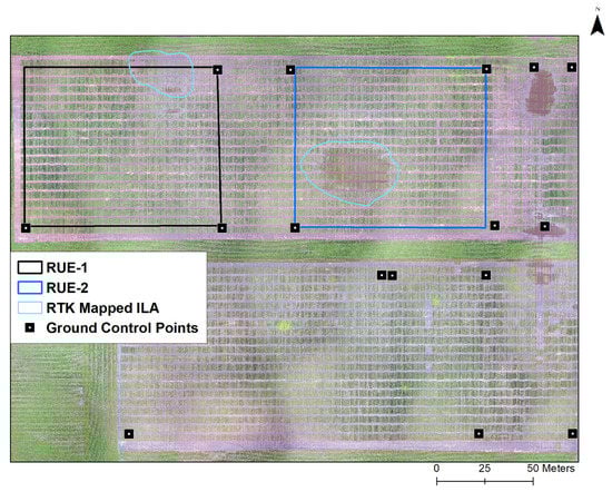 In addition, field measurements were collected to evaluate crop development as well as to map the extent of inundation. Soybean biomass samples were collected July 16th (60 days after planting) between the R4 and R5 stage. Above-ground biomass (g/m2) was sampled throughout each experiment (RUE-1 and RUE-2), collecting 383 and 377 samples, respectively. After collection, the soybean plants were oven-dried and weighed. The dry weight was used in the analysis. The field was harvested with a combine, and yield measurements were collected from a yield monitor for each plot. The TOPCON RTK was used to map the extent of inundation following rain events by surveying the perimeter of inundation, as shown in Figure 2. Some observed ILA was not mapped in order to reduce the amount of foot traffic within the field.