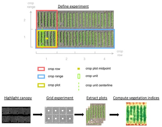 CIE is the first step in the high-throughput phenotyping processing pipeline. CIE has the ability to extract plot images from designed experiments with RGB, multispectral and thermal imagery captured by the UAS. Plot images are extracted from user-configured inputs that describe the AOI and generated outputs from image stitching software such as camera parameter files. For our study, Pix4D Mapper software was used [33]. User-defined inputs consisted of experimental metadata such as location, number of crop rows, ranges and units as well as length and spacing between plots. Figure 3 illustrates the components of a mapped experiment using CIE and outputted vegetation index with VID. A crop unit is defined as a single row of a soybean plot, so if the plot is described as a four-row plot, it is expected to see four crop units within each plot. Crop rows and ranges are the number plots along the x direction and y direction, respectively. The crop unit centerline is used to measure distance between crop units in both x and y direction. After the configuration is completed for the AOI, plots are extracted by segmenting the canopy and gridding the calculated locations of each plot (Figure 3). As the crop develops and changes color, CIE uses multiple segmentations and crop localization functions to identify the crop unit centerline to ensure that the correct number of crop units are identified within each crop plot [31]. The experimental metadata information along with the dimensions of the crop unit (crop length and spacing between crop rows) are then used to calculate the crop plot midpoint and map the remaining crop plots. The result is accurately and precisely identified crop plot midpoints that enable automated and rapid extraction of plot images. Depending on the size of the experiment, the generated CIE outputs can be thousands of plot images.