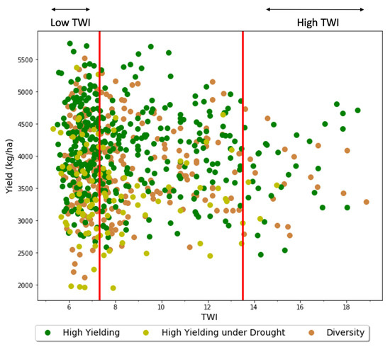 Scatter plot of the relationship between Topographic Wetness Index (TWI) and soybean yield (kg/ha) labeled by class. TWI thresholds at 7.4 and 13.5 were set to compare RUE-1 and RUE-2 replicates less likely to experience ILA to those that were more likely to experience ILA. The low and high TWI ranges used in analysis are represented by arrows.