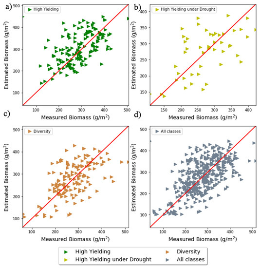 Scatter plots comparing estimated biomass with measured biomass at the R4–R5 development stage for each class and all classes in RUE-1 shown as triangles. (a) High Yielding, (b) High Yielding under Drought, (c) Diversity and (d) all classes. Parameters were estimated for each class to consider varying soybean genetics and for all classes to determine if one set of parameters could be representative for all classes.