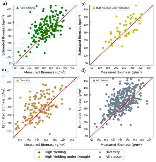 Scatter plots comparing estimated biomass with measured biomass at the R4–R5 development stage for each class and classes in RUE-2 shown as circles. (a) High Yielding, (b) High Yielding under Drought, (c) Diversity and (d) all classes. Parameters were transferred from RUE-1 to RUE-2.