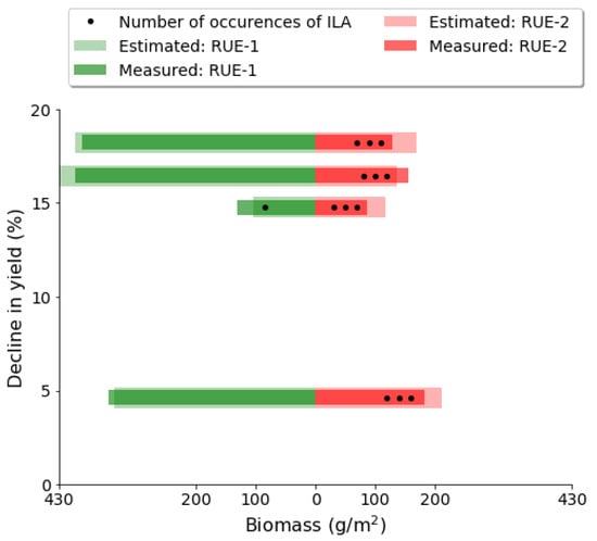 It has been established that biomass from the R4–R5 stage is sensitive to differences in wetness conditions, and that the fitted model is able to capture these differences. The next step is to translate these early season differences into differences in yield due to excess water stress alone. Figure 9 shows that the decreased biomass at the R4–R5 stage from plots experiencing ILA in RUE-2 also resulted in a decrease in yield ranging from approximately 5% to 18%, relative to the RUE-1 replicate. In most cases, the change in yield correlates with the change in biomass. Interestingly, the exception to this relationship is for a pair of replicate plots that both experienced occurrences of ILA, where in-field flooding had been observed once in RUE-1 and three times in RUE-2 (Figure 9). The measured and estimated biomass for the plots is relatively low compared to other plots, where the biomass is no more than 130 g/m2 at the R4–R5 stage. The decline in yield for RUE-2 relative to RUE-1, however, is approximately 15%. This implies that the RUE-1 plot actually recovered better from exposure to a single ILA occurrence, relative to the RUE-2 plot, which had three occurrences of ILA.