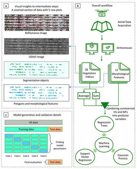 Workflow for image processing and analysis. (a) Visual insights of intermediate steps in the workflow showing reflectance, OSAVI image, segmented objects and extracted polygons and morphological features; (b) overall workflow adopted in this study covering data acquisition, orthomosaicking, vegetation index, morphological features, summarization of the image layers into predictor variables and used machine learning regressors; (c) model generation and validation details covering both cross-validation and dedicated testing.