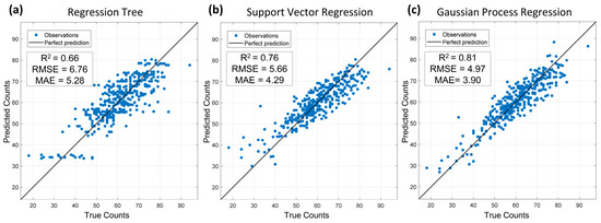 Cross-validation of machine learning model results. Three machine learning regression models (a) Regression tree, (b) Support vector regression and (c) Gaussian process regression models were applied on the training dataset. True counts are manually measured seedling emergences and predicted counts use a given model.