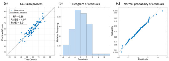 Dedicated validation of Gaussian processed regression (GPR) model results: (a) GPR model relationship, (b) Histogram of residuals plot and (c) Normal probability of residuals. True counts are manually measured seedling emergences and predicted counts use a given model.