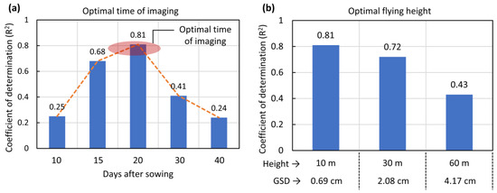 Cross-validation accuracy in GPR model development in terms of the coefficient of determination (R2). (a) R2 at different timing of aerial survey; (b) flying altitude of UAV. Note: the x-axis of bar graph plots is not linear.