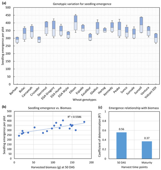 Seedling emergence profile of wheat genotypes and its effects on biomass in terms of the coefficient of determination (R2). (a) Variation of emergence between different genotypes of wheat as estimated from the method. Each of the floating column summarizes the variability among four replications; maxima and minima are represented by the top and bottom whiskers, respectively, 25th and 75th quartile represented by the second lower and second upper whiskers, respectively, and the average is represented by the middle whisker; (b) R2 of seedling emergence with the harvested biomass at vegetative growth stage of 50 DAS shown using a linear regression plot; (c) R2 of seedling emergence on harvested biomass at 50 DAS and maturity.