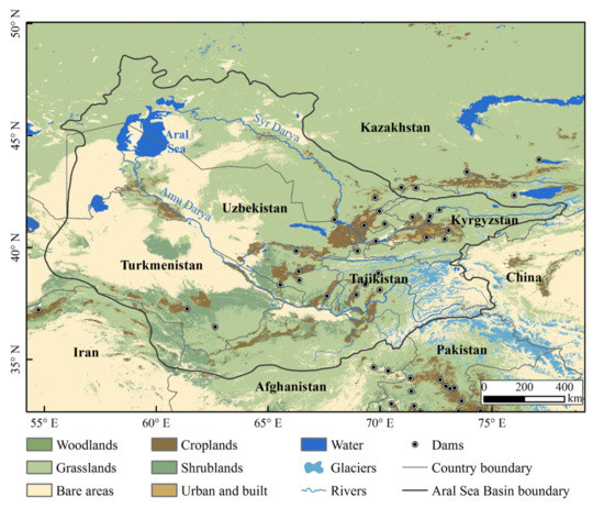 Land-use map of the Aral Sea Basin for the year 2002. The land-cover data were from the MODIS MCD12Q1 product, glacier data were derived from the Randolph Glacier Inventory (RGI) 6.0, and dam data were obtained from the Global Reservoir and Dam Database (GRanD).