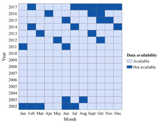 GRACE is a satellite mission jointly launched by the National Aeronautics and Space Administration (NASA) and the German Aerospace Center (DLR). It consists of twin satellites spaced ~220 km apart in a near-polar orbit at an altitude of ~450 km. The products of GRACE are released by the Scientific Data System composed of three major research groups: Center for Space Research (CSR), Geo-Forschungs-Zentrum (GFZ), and Jet Propulsion Laboratory (JPL). Several studies have demonstrated that spherical harmonic (SH) coefficients provided by the CSR can effectively reveal the variations in TWS, since the mass variations in atmosphere and ocean have been removed [22,39,40,41]. Therefore, the latest Release-06 (RL06) SH coefficients from the CSR were selected for this study. The data covered the period of April 2002 to June 2017, for a total of 163 months, and it was missing for 20 months (Figure 2).