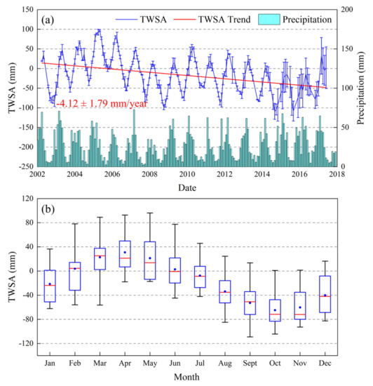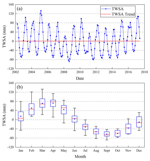 The variations in TWSA (a) and year-to-year variations in monthly TWSA (b) of the Aral Sea Basin from GLDAS during the period of April 2002 to June 2017. In (b), the red horizontal lines represent the month’s median TWSA, the blue dots represent the month’s average TWSA, the boxes represent the inner-quartile range, and the whiskers represent the full range of the data.