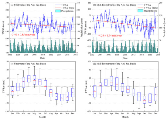 The variations in TWSA and precipitation of the upstream (a) and mid-downstream (b) of the Aral Sea Basin, and the year-to-year variations in monthly TWSA of the upstream (c) and mid-downstream (d) of the Aral Sea Basin from April 2002 to June 2017. In (a,b), the blue bars represent the data uncertainty. In (c,d), the red horizontal lines represent the month’s median TWSA, the blue dots represent the month’s average TWSA, the boxes represent the inner-quartile range, and the whiskers represent the full range of the data.
