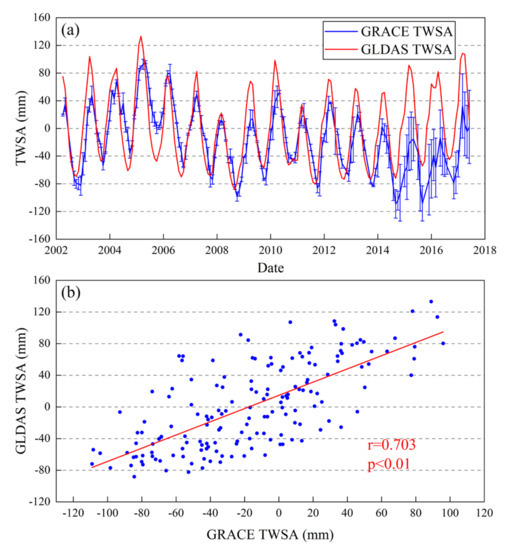 The authors are very grateful to the Center for Space Research at the University of Texas at Austin, for providing GRACE RL06 Level 2 product (ftp://podaac.jpl.nasa.gov/allData/grace/L2/CSR/RL06/ (accessed on 1 October 2019)), and the Goddard Earth Sciences Data and Information Services Center, NASA, for providing GLDAS-2.1 outputs (https://disc.gsfc.nasa.gov/datasets?keywords=GLDAS (accessed on 1 October 2019)). We appreciate the editors and the three anonymous reviewers for their valuable suggestions and advice.