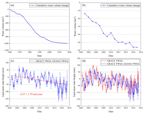 Based on water volume data of the Aral Sea obtained from CAWATER-info (http://www.cawater-info.net accessed on 1 October 2019) and previous study [14], the variations in water volume of the Aral Sea during the periods of 1960–2018 and 2002–2017 are presented in Figure 9a,b. Although the water volume of the Aral Sea exhibited a sharp decline during the past six decades, the declining rate has been relatively slow from 2002 to 2017 (3.75 km3/year). Given that the Aral Sea is the major component of surface water in the Aral Sea Basin, we roughly estimated the change rate of surface water in the basin using the variations in the water volume of the Aral Sea. Results indicated that surface water in the Aral Sea Basin decreased at a rate of 2.19 mm/year, accounting for ~53.16% of the declining rate of GRACE TWSA.