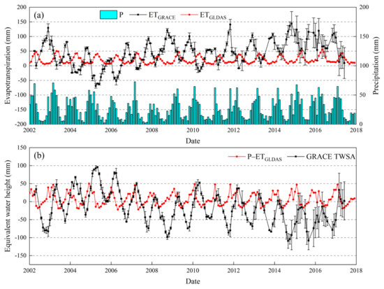 Moreover, to quantify the impacts of human activities on the variations in ET, ET obtained from GLDAS was compared with the total ET estimated from GRACE. The total ET can be estimated as: