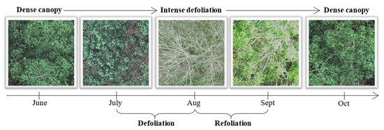Phenological stages of defoliation and foliation period for rubber wintering at canopy-level. The pictures show the top view of the canopy taken from June to October using a drone at a fixed location in the study area.