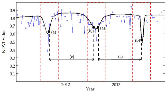 - Eklundh, L.; Jönsson, P. TIMESAT: A software package for time-series processing and assessment of vegetation dynamics. In Remote Sensing Time Series: Revealing Land Surface Dynamics; Kuenzer, C., Wagnerm, W., Dech, S., Eds.; Springer: Cham, Switzerland, 2015; pp. 141–158. ISBN 9783319159669. [Google Scholar]