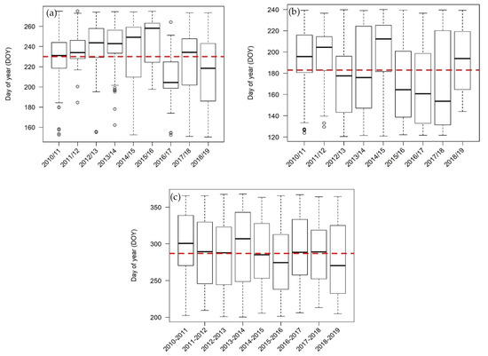 Inter-annual variations of: (a) SOS; (b) EOS; and (c) LOS for the corresponding years as observed with MODIS 8-day NDVI. The red dashed lines indicate the mean of SOS (DOY 230), EOS (DOY 183), and LOS (318 days). Each central rectangle spans from the first quartile to the third quartile. The whiskers above and below the box show the maximum and minimum values. The thick black lines inside the rectangle represent the median, and the dots are the outliers.