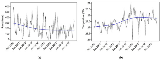 We used the Mann–Kendall test and Sen’s slope estimator for detecting monotonic trends in rainfall and temperature. The total monthly rainfall and average monthly temperature data from 2010 to 2019 were used for this purpose. The data, including trend lines, were plotted in Figure 8. The trend line used for both plots in this figure is a Loess regression line, commonly used for smoothing a volatile time-series such as climate data.