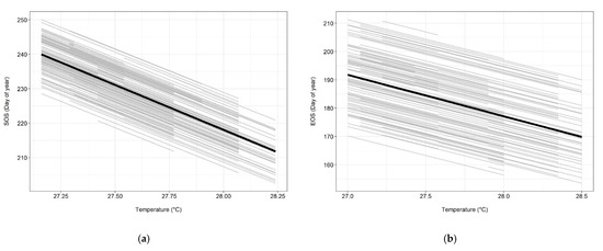 The results suggest that the random effect of pixel plays a role in influencing both SOS and EOS. All pixels in Figure 9 consistently showed a decreasing trend in SOS/EOS. This indicates that although there is rubber multiclonal planting, all clones in the study area respond similarly to temperature. In general, the level of SOS/EOS response to pre-SOS/EOS temperature were calculated to be −25.26 days/°C and −13.78 days/°C, respectively. These negative coefficients indicate that an increase in temperature advances the SOS/EOS dates, and vice versa.