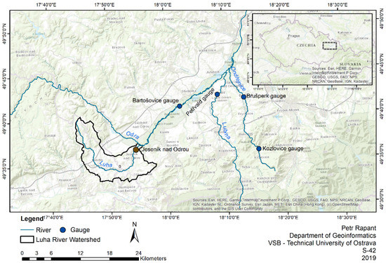 Figure 1. The Novojičínsko area with the Luha River Watershed and hydrometric gauge stations. - The data from the Fire Rescue Service of the Czech Republic database, which included 439 events on 10–11 June 2013 and 231 events on 27 May 2014.