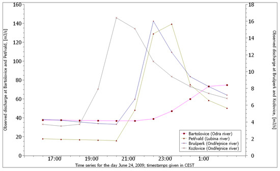 Figure 4 shows that the river Odra, a major watercourse in this area, seamlessly absorbed the storm outflow from individual tributaries. On the contrary, in the profile Kozlovice on the river Ondřejnice, there was a sharp increase in the flow rate after 18:00 CEST, culminating at 20:00 CEST. This culmination occurred approximately two hours later in Brušperk. Similarly, in the profile from Petřvald on the river Lubina, there was a sharp increase in the flow at 21:00 CEST. In all of these cases, water levels increased sharply, reached a short peak, and rapidly declined. This development is typical for flash floods caused by heavy rainfall.
