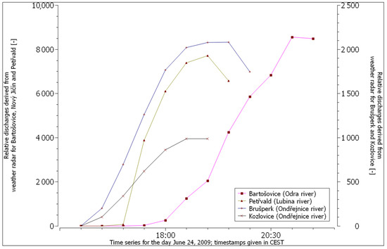 Figure 5 shows the leading edges of the predicted flash flooding hazard in the individual section of the watercourses in the affected area, passing through the abovementioned hydrometric station. We can observe a very similar trend between the forecasted flash flooding hazard and the actual measured river flows (Figure 4). The only exception is the Bartošovice gauge station. We can see the different pattern between the rising limb of the predicted hazard and actual flow. The catchment area of this gauge station is 913 km2. The catchment area of the sub-watersheds that was hit by heavy rain, belonging to the Bartošovice station, is 214 km2. The influence of the affected area on the total flow through the Bartošovice station is, therefore, limited.