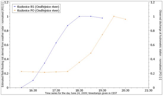 The first comparison was made at the hydrometric station in Kozlovice. We used the leading edge of the forecasted flash flooding hazard (marked as RS, data from the weather radar) and graphically compared it with the leading edge of the real flow curve (marked as PO, data from the hydrometric station; Figure 6). To ensure comparability of both curves, we converted them into a normalised scale with values between 0 and 1, determined by dividing the values of each curve by the maximum value of the respective curve.