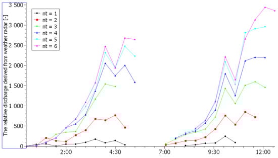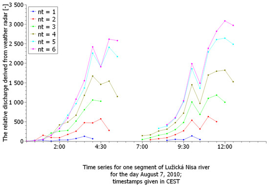 For this transformation, routing was defined in the network of watercourse segments in the monitored area, represented by a weighted tree-type graph. The routing transforms the 2D signal registered above the sub-watershed area during the basic evaluation time step (as the sum of the raw radar reflections for all records falling into this time step) into a 1D signal representing the runoff through the backbone watercourse. This 1D signal is immediately propagated through a network of watercourse segments downstream to a distance corresponding to the outflow velocity in the channel and the selected outflow summation interval. It is assumed that the outflow in the riverbed is moving with the constant and same velocity. The 1D signal from the individual tributaries gradually accumulates. Finally, each segment is weighted by the cumulative value of the 1D signal per outflow summation interval.