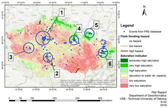 Comparison of the predicted flash flooding hazard on individual sections of the watercourses for the rainfall episode on 10–11 June 2013, the saturation indicator on 10 June 2013, 08:00 CEST (the saturation indicator provided by © CHMI CC BY-NC-ND; red shades represent dry areas, green shades represent saturated areas), and events relating to Fire Rescue Service interventions in the period from 10 June 2013, 12:00 CEST to 11 June 2013, 11:55 CEST. Blue circles delimit numbered areas, commented on in the text of the article.