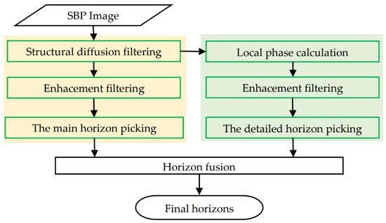 This paper proposes an integrated method based on diffusion filtering, enhancement filtering, and local phase calculation to obtain the main and detailed horizons on a SBP image and is verified by data measured in different cases. Experiments show that the method is able to provide good results. The diffusion filtering method smooths the line-like structures of the reflectors and eliminates noise at the same time. The local phase image highlights all of the reflections and is quite important for obtaining the detailed horizons. Enhancement filtering enhances line-like structures well and weakens the effect of noise. The suppression of vertical structures in enhancement filtering can maintain the actual horizons and suppress false vertical structures in images after diffusion filtering and local phase calculation, which allows accurate horizon picking. In future work, we will further extend the method to pick horizons representing scattered echoes and combine this method with a deep learning framework to achieve better results and to realize real-time SBP horizon picking.