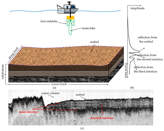The working principles of SBP are shown in Figure 2a. The SBP sonar transmits an acoustic wave that is vertically aimed at the seafloor [1]. The acoustic wave is reflected back when it encounters an acoustic impendence difference interface, e.g., the seafloor or the interface between silt and sand. A large impendence difference can generate a large amplitude of the received acoustic amplitude, which can reflect the sediment property. Thus, the reflected acoustic waves carry information regarding the sediment properties, which are then received by the sonar.