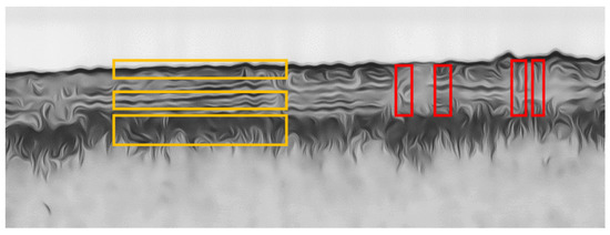 SBP image characteristics after diffusion filtering. Yellow rectangles mark the line-like structures of reflectors. Red rectangles highlight the false vertical structures caused by intensity imbalance phenomena.