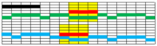 Centered at every main horizon point, neighborhoods along the vertical direction can be defined. As shown in Figure 5, the yellow shadowed areas show the neighborhoods defined by the red main horizon points. Detailed horizon points that are located in the yellow shadowed areas can then be found by traversing the yellow areas. Since every detailed horizon point is assigned a label, the labels of the detected detailed horizon point can then be obtained after traversing the yellow shadowed areas in Figure 5. After that, all of the detailed horizon points corresponding to the obtained labels can be extracted, which means that all of the green and blue horizon points in Figure 5 can be obtained. If the length of the extracted detailed horizon segment is larger than the length of the corresponding main horizon segment, the extracted detailed horizon segment will remain, while the corresponding main horizons will be removed, otherwise, the extracted horizon segment will be removed as outliers while the main horizons remain. All of the detailed horizon points with the constraints of the main horizon points can be obtained. Outliers such as the black points in Figure 5 will be removed.