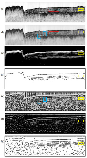 Enhancement filtering is applied to the image after diffusion filtering. As shown in Figure 3, the yellow rectangles mark several reflectors that extend along the horizontal direction. These reflectors can be recognized as line-like structures, and some filtering methods can be employed to enhance these structures and eliminate interference echoes [3,18]. Thus, an improved line-like structure enhancement filtering method is used to highlight reflectors and suppress interference.