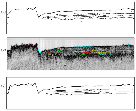 Result of horizon picking. (a) shows the final horizons after horizon fusion. (b) shows the superposition of picked horizons with the original SBP image. Horizon points belonging to the same horizon segment are assigned the same color. (c) shows the ground truth obtained through manual picking.