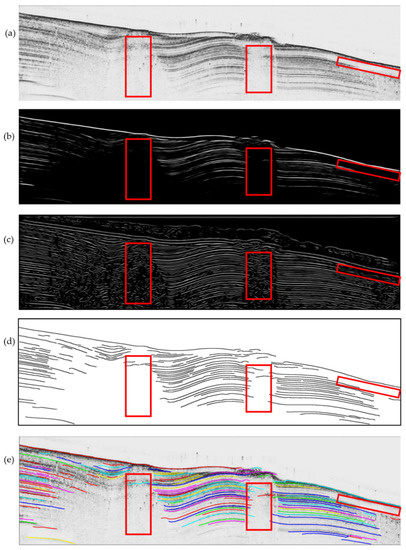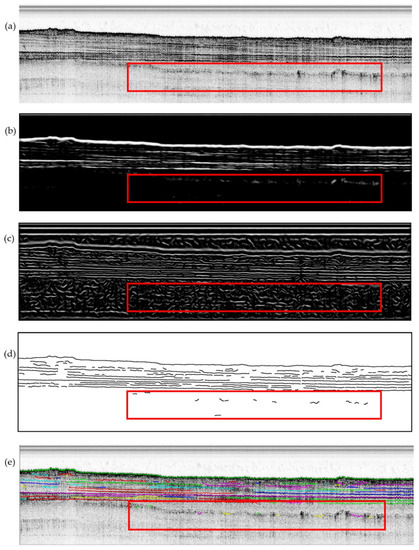 Processed results of SBP image. (a) shows the original SBP image. (b) the SBP image after enhancement filtering based on diffusion filtering result. (c) shows the SBP image after enhancement filtering based on local phase. (d) shows the final horizons. (e) shows the superposition of picked horizons with the original SBP image. Horizon points belonging to the same horizon segment are assigned the same color.