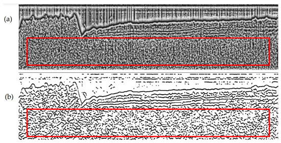 The SBP image after diffusion filtering and local phase calculation are shown in Figure 4a,b. There are intensity imbalance phenomena on the original SBP image distributed along the vertical direction, and these vertical imbalance structures will be specifically highlighted after diffusion filtering and local phase calculation. Thus, there are lots of false structures (as shown in Figure 4b marked with red rectangles) along the vertical direction. To eliminate these false structures and enhance the reflector structures, enhancement filtering can be applied to the phase image. The method described in Equation (12) is also applied to pick the detailed horizon points based on the local phase image after enhancement filtering.